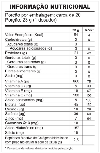 1 FIRMEZA E ELASTICIDADE Auxilia na redução dos sinais do envelhecimento, mantendo a firmeza e elasticidade da pele. INGREDIENTES Colágeno hidrolisado, vitaminas (C, E, A, B6, B12), minerais (zinco, selênio), aromas idênticos aos naturais conforme sabor, edulcorante sucralose.