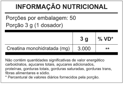 1 Creatina monohidratada Creapure® Padrão de pureza e qualidade internacional. INGREDIENTES Creatina monohidratada. Quantidade por porção 3g % VD* Creatina monohidratada. 3000 **