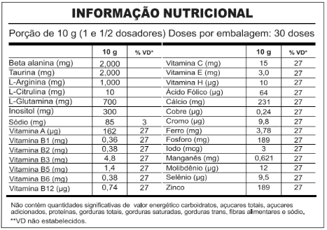 INGREDIENTES Beta alanina, taurina, L-arginina, L-glutamina, inositol, citarg (alga chondrus crispus invernal), pré mix de vitaminas e minerais, extrato de menta (Mentha piperita L.), picolinato de cromo, acidulante ácido cítrico, aroma idêntico ao natural de abacaxi, edulcorante sucralose, ciclamato de sódio, acessulfame de potássio e sacarina sódica, antiumectante dióxido de silício, corante artificial amarelo tartrazina. INFORMAÇÃO NUTRICIONAL Porção: 10 g (1 e 1/2 dosadores). Doses por embalagem: 30 doses.