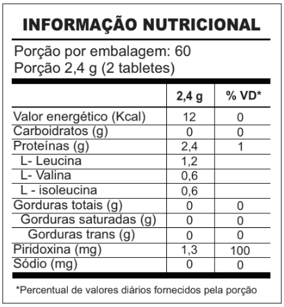 1 AMINOÁCIDOS ESSENCIAIS Contém aminoácidos essenciais (BCAA) para suporte à recuperação e construção muscular. INGREDIENTES L-Leucina, L-Valina, L-Isoleucina, piridoxina (vitamina B6) e celulose micronizada.