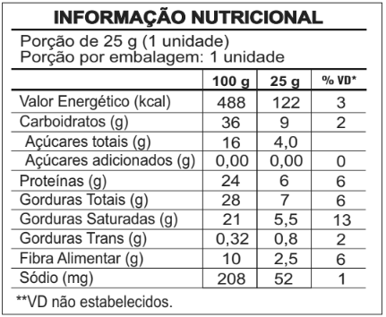 INGREDIENTES Cobertura proteica zero açúcar sabor chocolate ao leite (concentrado proteico do soro de leite, gordura vegetal, cacau em pó natural, maltitol, soro de leite em pó, polidextrose, leite em pó desnatado, emulsificante: lecitina de soja, aromatizante idêntico ao natural e edulcorante: sucralose), ganache zero açúcar sabor chocolate meio amargo (gordura vegetal, maltitol, polidextrose, cacau em pó natural, leite em pó desnatado, licor de cacau, emulsificante: lecitina de soja e aromatizante idêntico ao natural), placa de wafer (farinha de trigo enriquecida com ferro e ácido fólico, gordura vegetal hidrogenada, cloreto de sódio, emulsificante: lecitina de soja e fermento químico: bicarbonato de sódio). INFORMAÇÃO NUTRICIONAL Porção de 25 g (1 unidade). Porção por embalagem: 1 unidade.