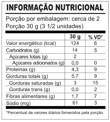 SHARK PRO SUPLEMENTO ALIMENTAR À BASE DE PROTEÍNA INGREDIENTES Morango: Biscoito [farinha de arroz branco, gordura vegetal, amido de milho, polidextrose, cacau black, fécula de batata, amido pré-gel, maltitol, sal hipossódico, fermento químico em pó, goma guar, lecitina de girassol, aromatizante idêntico ao natural e corante preto artificial (vermelho II, azul I e amarelo tartrazina)], recheio creme de ganache zero açúcar sabor morango e lecitina de soja (gene doador Agrobacterium tumefaciens, Streptomyces viridochromogenes, Bacillus thuringiensis). Baunilha: Biscoito [farinha de arroz branco, gordura vegetal, amido de milho, polidextrose, cacau black, fécula de batata, amido pré-gel, maltitol, sal hipossódico, fermento químico em pó, goma guar, lecitina de girassol, aromatizante idêntico ao natural e corante preto artificial (vermelho II, azul I e amarelo tartrazina)], recheio creme de ganache zero açúcar sabor baunilha e lecitina de soja (gene doador Agrobacterium tumefaciens, Streptomyces viridochromogenes, Bacillus thuringiensis). Chocolate: Biscoito [farinha de arroz branco, gordura vegetal, amido de milho, polidextrose, cacau black, fécula de batata, amido pré-gel, maltitol, sal hipossódico, fermento químico em pó, goma guar, lecitina de girassol, aromatizante idêntico ao natural e corante preto artificial (vermelho II, azul I e amarelo tartrazina)], recheio creme de ganache zero açúcar sabor chocolate ao leite e lecitina de soja (gene doador Agrobacterium thuringiensis). INFORMAÇÃO NUTRICIONAL Porções por embalagem: cerca de 2 Porção 30 g (3 1/2 unidades)