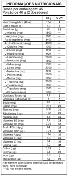 Proteína Concentrada do Soro de Leite, Glutamina, mix de vitaminas (acetato de retinol, mononitrato de tiamina, riboflavina, niacinamida, pantotenato de cálcio, cloridrato de piridoxina, cianocobalamina, ácido ascórbico, acetato de tocoferol, D-biotina, ácido fólico, carbonato de cálcio, sulfato de cobre, picolinato de cromo, iodeto de potássio, molibdato de sódio, selenito de sódio), aromas idênticos aos naturais conforme sabor, edulcorante sucralose e corantes permitidos pela Anvisa.